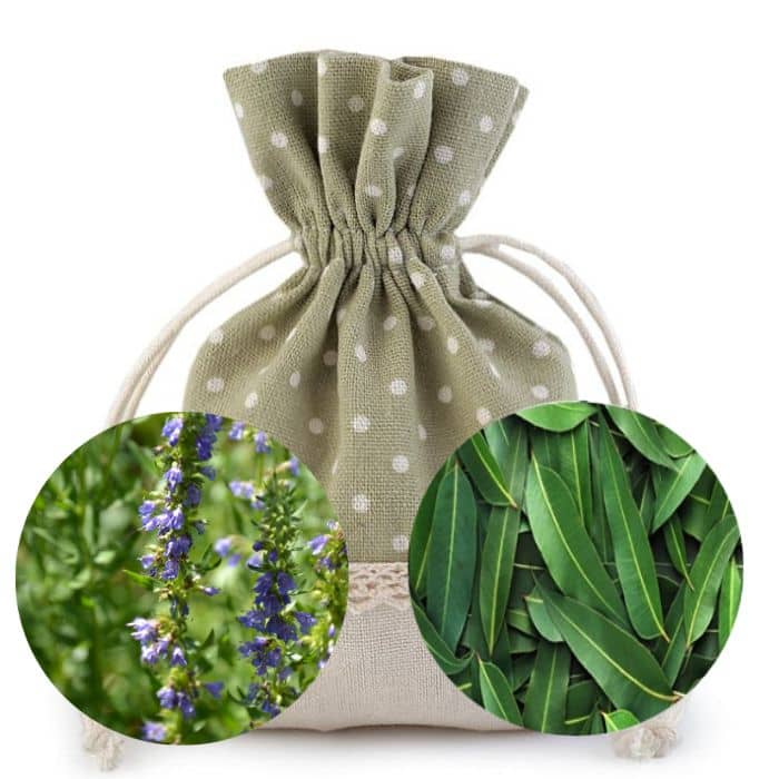 Eukalyptus a yzop se používají pro podporu zdraví dýchacích cest. Přispívají i k celkové harmonie a klidnému spánku. Pytlíček můžeme umístit vedle sebe, zavěsit jej nad postelí, v autě apod. Lze jej též brát s sebou např. do práce či na cesty.