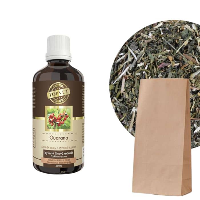 Set obsahuje dva produkty, které jsou baleny zvlášť: guarana (tinktura či kapsle) a mučenka nať.
